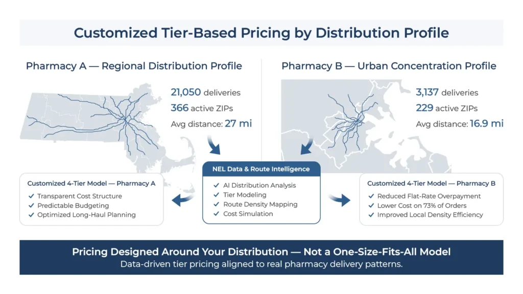 This analysis of 24,187 deliveries across two distinct pharmacy profiles demonstrates that tier-based pricing delivers measurable value – whether through direct cost savings (for locally-concentrated pharmacies like Pharmacy B) or through transparency and predictability (for regionally-dispersed pharmacies like Pharmacy A).
