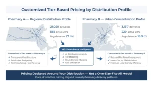 To demonstrate the impact of tier-based pricing, we analyzed delivery data from two pharmacies with distinct distribution patterns over a 6-month period (January – June 2025).
